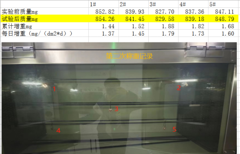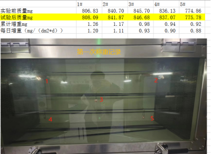 2023年浙江******產(chǎn)品檢驗有限公司第二次采購我司一臺型號為“WHQ-900B”型的混合氣體腐蝕試驗箱,設備在出廠(chǎng)之前,工作人員已經(jīng)在我內部的實(shí)驗室進(jìn)行過(guò)一次合格的銅片增重測試,之后設備被運送到客戶(hù)指定的場(chǎng)地安裝調試運行??蛻?hù)在設備運行了一個(gè)階段后,自行進(jìn)行一次銅片增重試驗,試驗結束之后客戶(hù)將數據發(fā)給我司,以下是客戶(hù)和我的聊天記錄和客戶(hù)第一次做的數據: